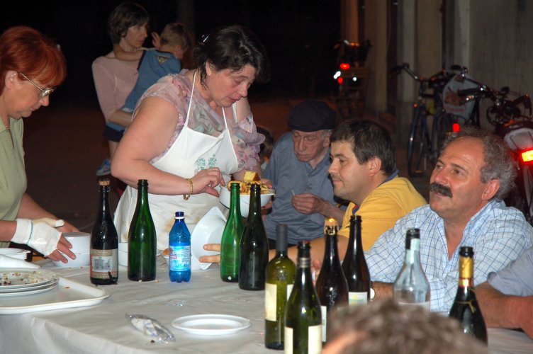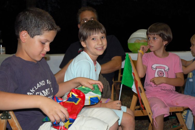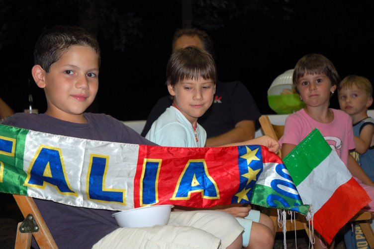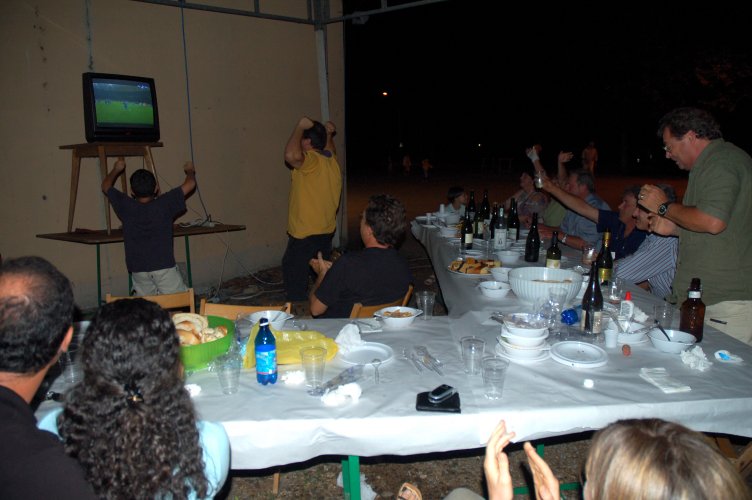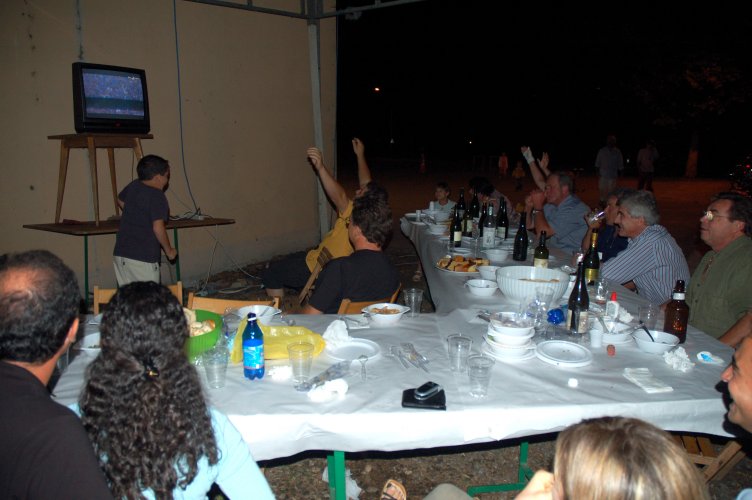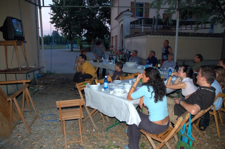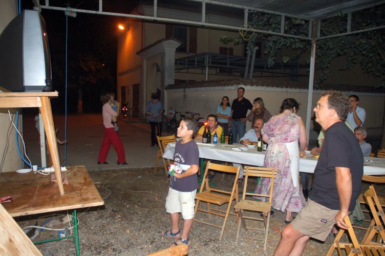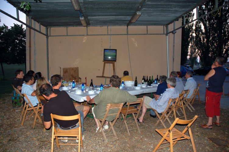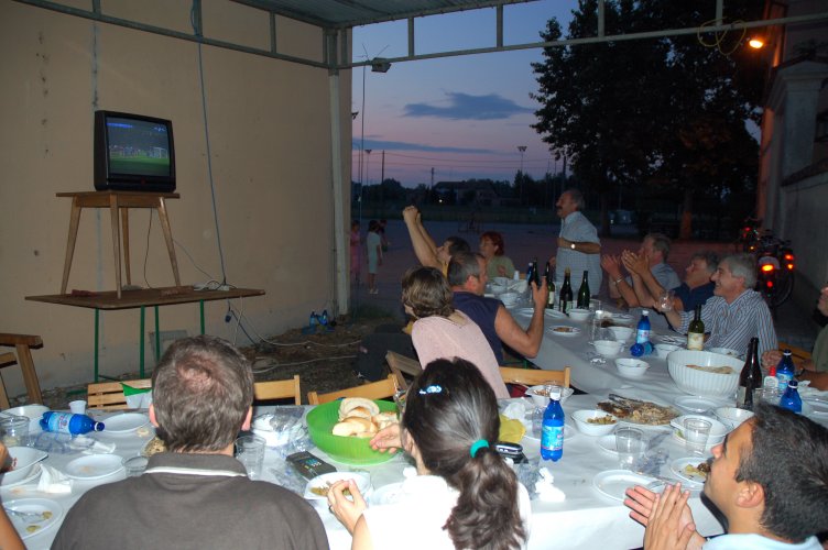 Gasati come non mai, dopo la sofferta, meravigliosa vittoria in semifinale sulla Germania (con i gol di Grosso al 118.mo e di Del Piero al 120.mo minuto!), avevamo deciso di rifarlo, ma stavolta con cena in grande stile e visione della partitissima su maxi schermo. Poi gli impegni e la realtà ci hanno ricondotti a più miti consigli: un paio di tavolacci ricuperati dal materiale della festa di giugno, appoggiati su cavalletti, per mangiare, ed il nostro vecchio televisore 28 pollici, rigorosamente a tubo catodico, precariamente innalzato contro la parete est della "barchessa".