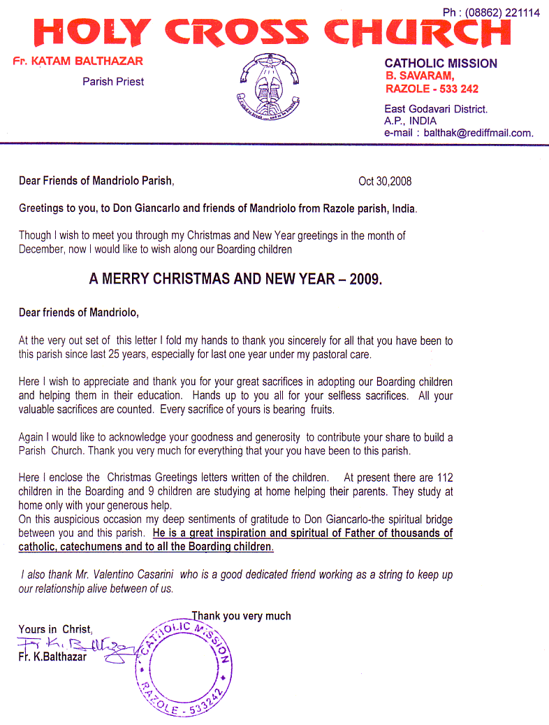 Here I enclose the Christmas Greetings letters written of the children. At present there are 112 children in the Boarding and 9 children are studying at home helping their parents. They study at home only with your generous help. On this auspicious occasion my deep sentments of gratitude to Don Giancarlo - the spiritual bridge between you and this parish. He is a great inspiration and spiritual of Father of thousands of catholic, catechumens ad to all then Boarding children. |