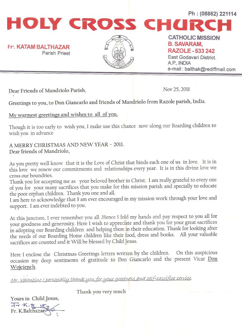 Posta ricevuta: lettera del 25.11.2011, da padre Katam Balthazar, parroco di Razole.