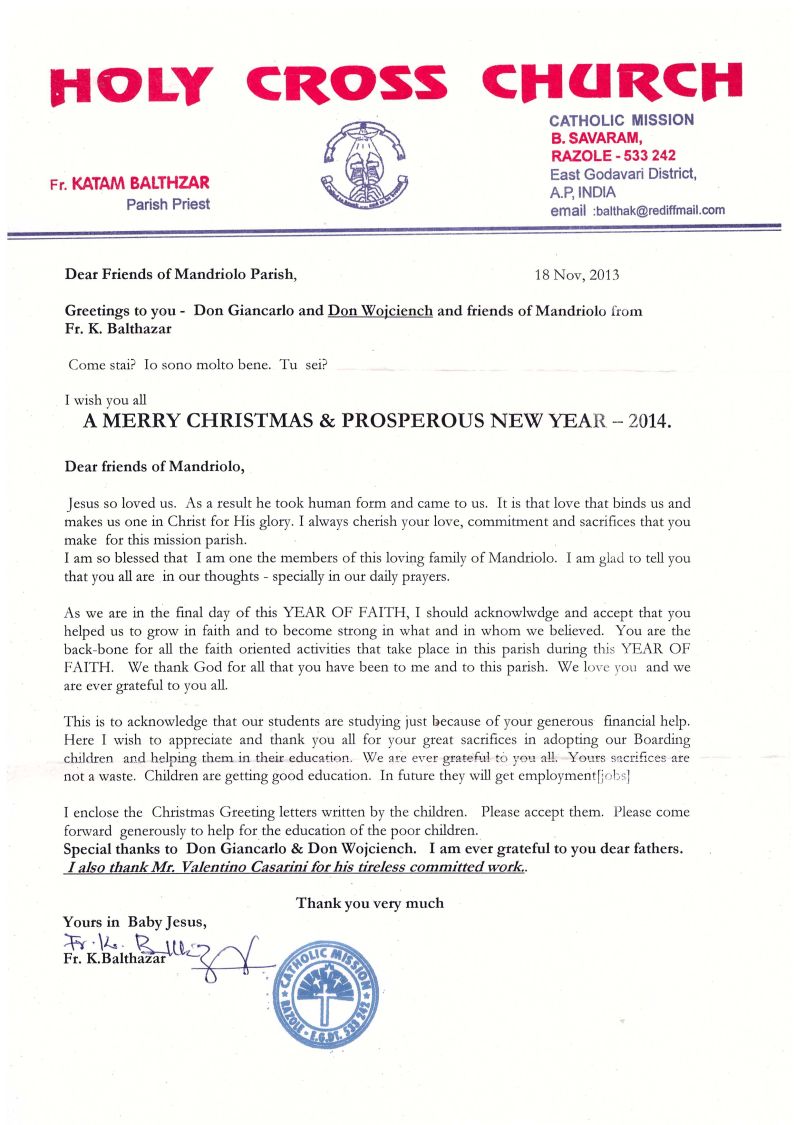Posta ricevuta: lettera del 18.11.2013, da padre K. Balthazar, parroco di Razole. Ci invia i saluti di Natale e di Buon anno 2014. In altre due lettere, inviate negli stessi giorni, ci informa che la missione cresce e si consolida nella fede; che l’opera di evangelizzazione è efficace e la gente accoglie la Parola di Dio; che i bambini poveri che aiutiamo pregano quotidianamente per noi. Nello stesso tempo p. Balthazar di mette al corrente di alcune difficoltà riguardanti l’ospitalità agli stessi bambini. Ecco cosa ci dice: