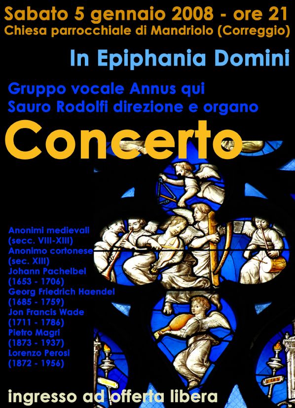 Sabato 5 gennaio 2008, alle ore 21.00, nella chiesa della Santissima Annunziata, a Mandriolo, il gruppo vocale «Annus qui» (del quale fanno parte anche valenti coristi della nostra comunità), diretto dal maestro Sauro Rodolfi, si esibirà in un concerto natalizio. Partecipate numerosi.