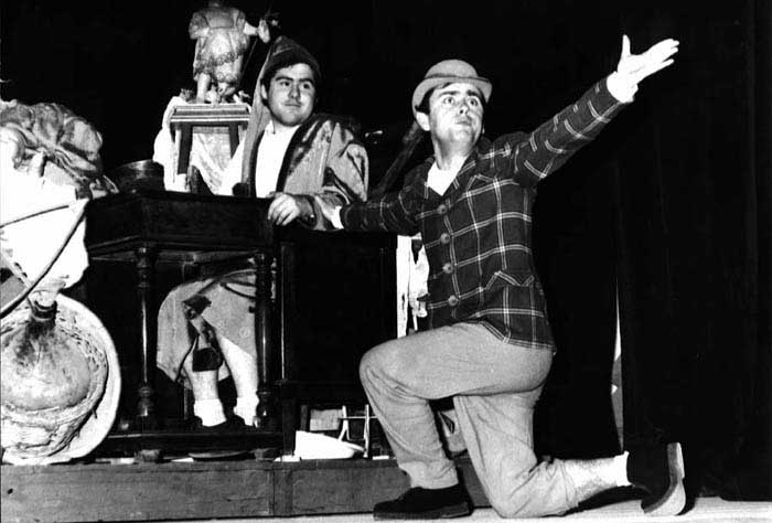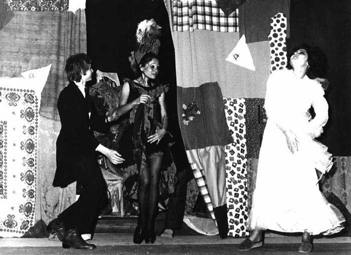 La scenografia è costituita da un’incredibile accozzaglia di robaccia, di ciarpame, di vecchiume, meglio se di dubbio gusto. Anche la scelta delle musiche d’accompagnamento è rigorosamente improntata al reperimento dei pezzi sonori più kitsch: dal Suppé dolciastro di Poeta e contadino, allo scontato Rossini della Cavalcata dal Guglielmo Tell, per arrivare - dulcis in fundo - all’immancabile Mattino di Grieg... Tutto è stato articolato, almeno nelle intenzioni di chi ha preparato il lavoro, per grattare un po’ la scorza del convenzionale e per decretare rimorto un certo mondo (per un momento riportato in vita) con un accesso di riso, anche se - ammettiamolo - notevolmente amaro. Operazione gratuita? Inutile? Anche sui termini di necessarietà e sulla funzione del messaggio in un’opera teatrale ci sarebbe molto da discutere!