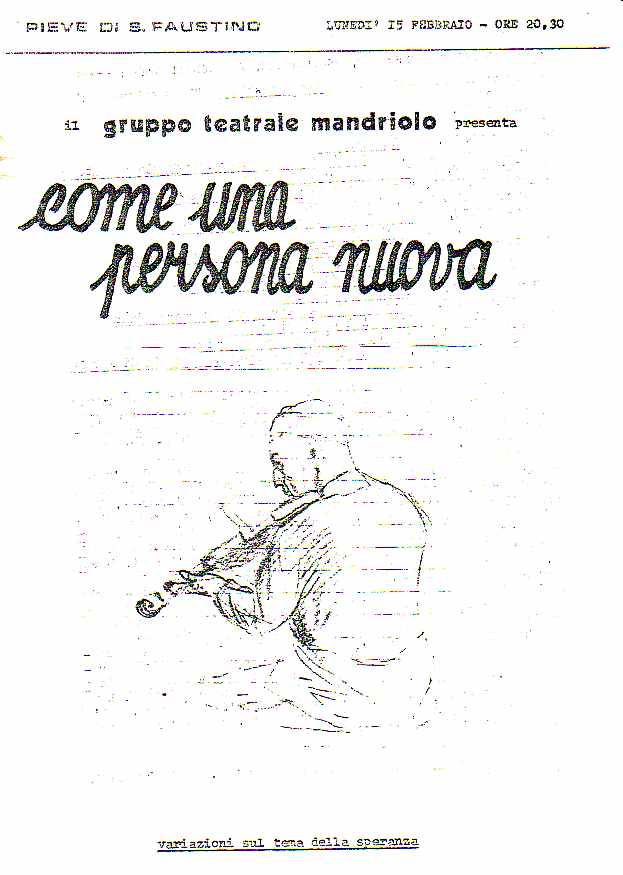 Come una persona nuova (recital, da autori vari contemporanei, elaborazione originale). Gruppo Teatrale Mandriolo, 1981 Come una persona nuova (recital, da autori vari contemporanei, elaborazione originale). Gruppo Teatrale Mandriolo, 1981