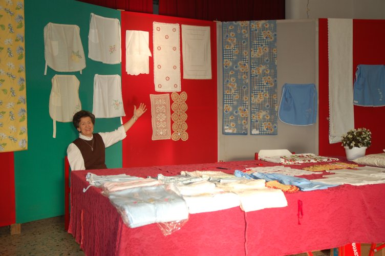 Deanna N. e Mariagrazia L. hanno allestito lo spazio della biancheria ricamata a mano da donne mandriolesi: in particolare modo va citata una tovaglia da altare che è stata esposta pur essendo già venduta, perchè é veramente unopera artistica, tutta ricamata da Ambellina C. con perizia e bravura indicibili.