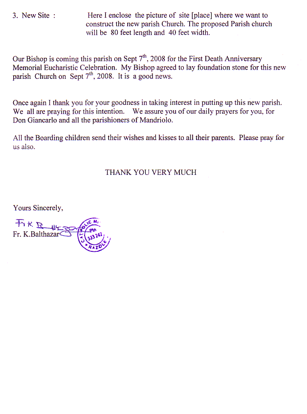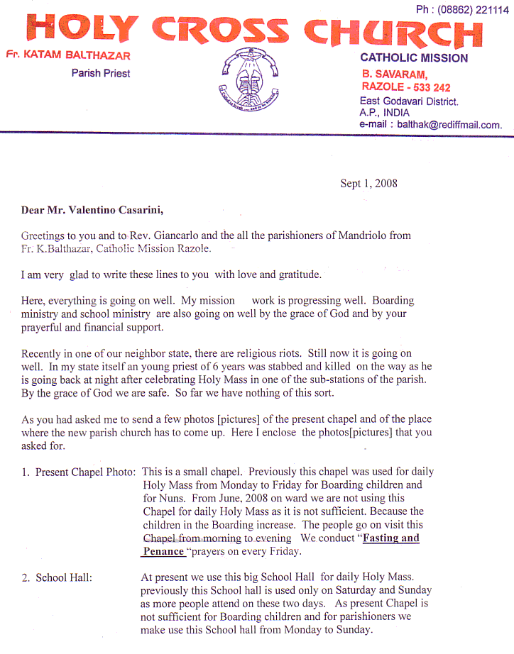 Greetings to you and to Rev. Giancarlo and the all the parishioners of Mandriolo from Fr. K. Balthazar, Catholic Mission Razole. I am very glad to write these lines to you with love and gratitude.