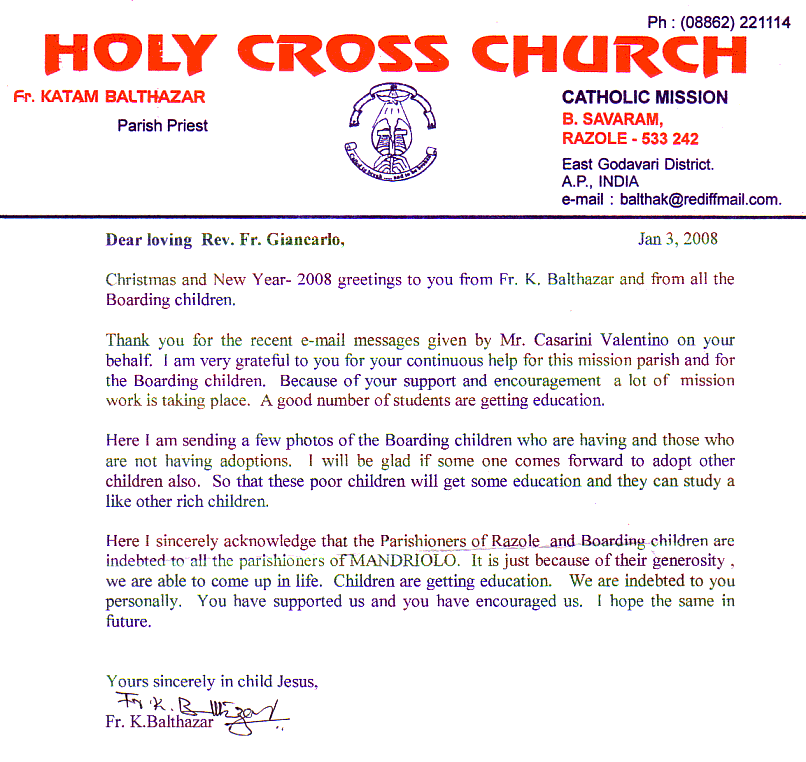 Lettera del 3 gennaio 2008 scritta da Padre K. Balthazar, parroco di Razole.
