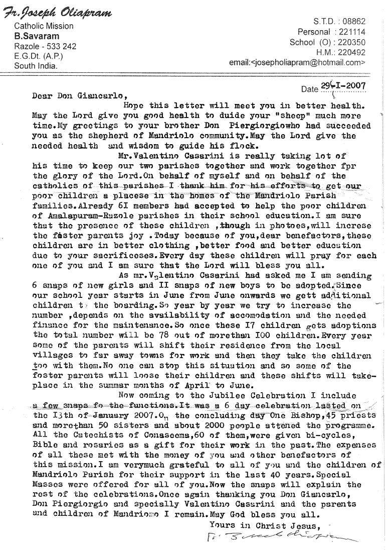 | Mr. Valentino Casarini is really taking lot of his time to keep our two parishes together and work together for the glory of the Lord. On behalf of myself and on behalf of the catholics of this parishes I thank him for his efforts to get our poor children a places in the homes of the Mandriolo Parish families. Already 61 members had accepted to help the poor children of Amalapuram-Razole parishes in their school education. I am sure that the presence of these children though in photoes, will increase the foster parents joy. Today because of you, dear benefactors, these children are in better clothing, better food and better education due to your sacrificeses. Every day these children will pray for each one of you and I am sure that the Lord will bless you all. | Valentino Casarini sta davvero dedicando molto del suo tempo per mantenere vivi i rapporti tra le nostre due parrochie affinché esse collaborino a rendere gloria al Signore. Da parte mia e dei cattolici di queste parrocchie lo ringrazio per avere procurato ai nostri poveri bimbi un posto nelle case delle famiglie di Mandriolo. Già 61 famiglie hanno accettato di aiutare i ragazzi poveri di Amalapuram-Razole nel loro percorso educativo. Sono sicuro che la presenza di questi bimbi, benché in foto, procurerà letizia a chi li aiuta. Oggi, grazie a voi ed ai vostri sacrifici, cari benefattori, questi ragazzi sono meglio vestiti, nutriti ed assistiti. Essi pregheranno per ciascuno di voi ogni giorno e sono certo che il Signore vi benedirà tutti. | |
