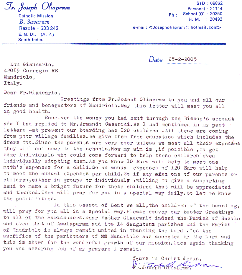 Lettera inviata da Padre Joseph Oliapram, parroco di Razole (India), a Mandriolo il 25 febbraio 2005.
