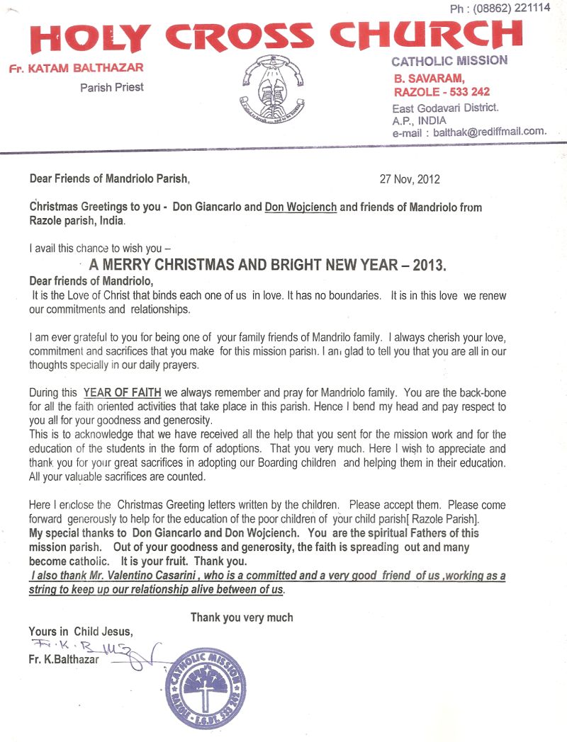 Posta ricevuta: lettera di domenica 27.11.2012, da padre Katam Balthazar, parroco di Razole.