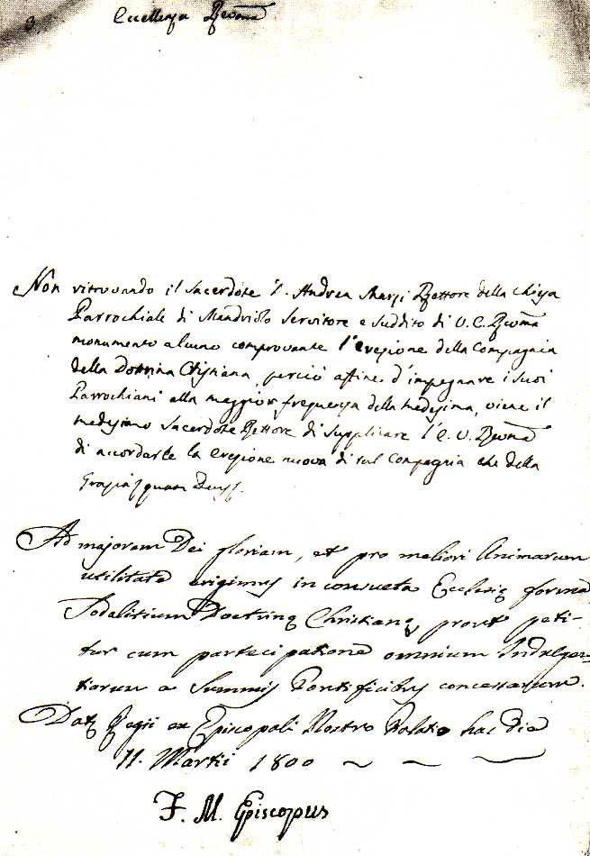 e) Due censi fruttiferi del 6% e 7% di lire 946 e lire 63,96, provenienti l’uno dalla Confraternita del SS.mo del Castello di Montecchio e l’altro dalla Compagnia della Dottrina di Montecchio, furono assegnati alla chiesa di Mandriolo il 25 giugno 1822 dal Vescovo di Modena Marchese Tiburzio Cortese.